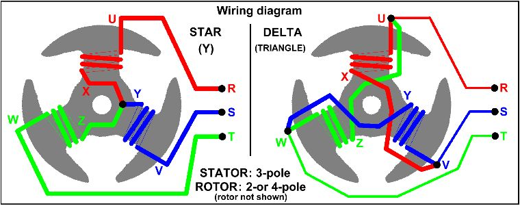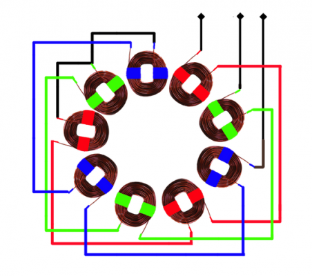 Motor 2 cực điện có 6 cuộn dây đồng 4 cực điện có 12 cuộn dây 6 cực điện có 18 cuộn dây, 8 cực có 24 cuộn dây; tốc độ motor tương ứng với 4 loại này là 2900, 1400, 900, 700 vòng phút.